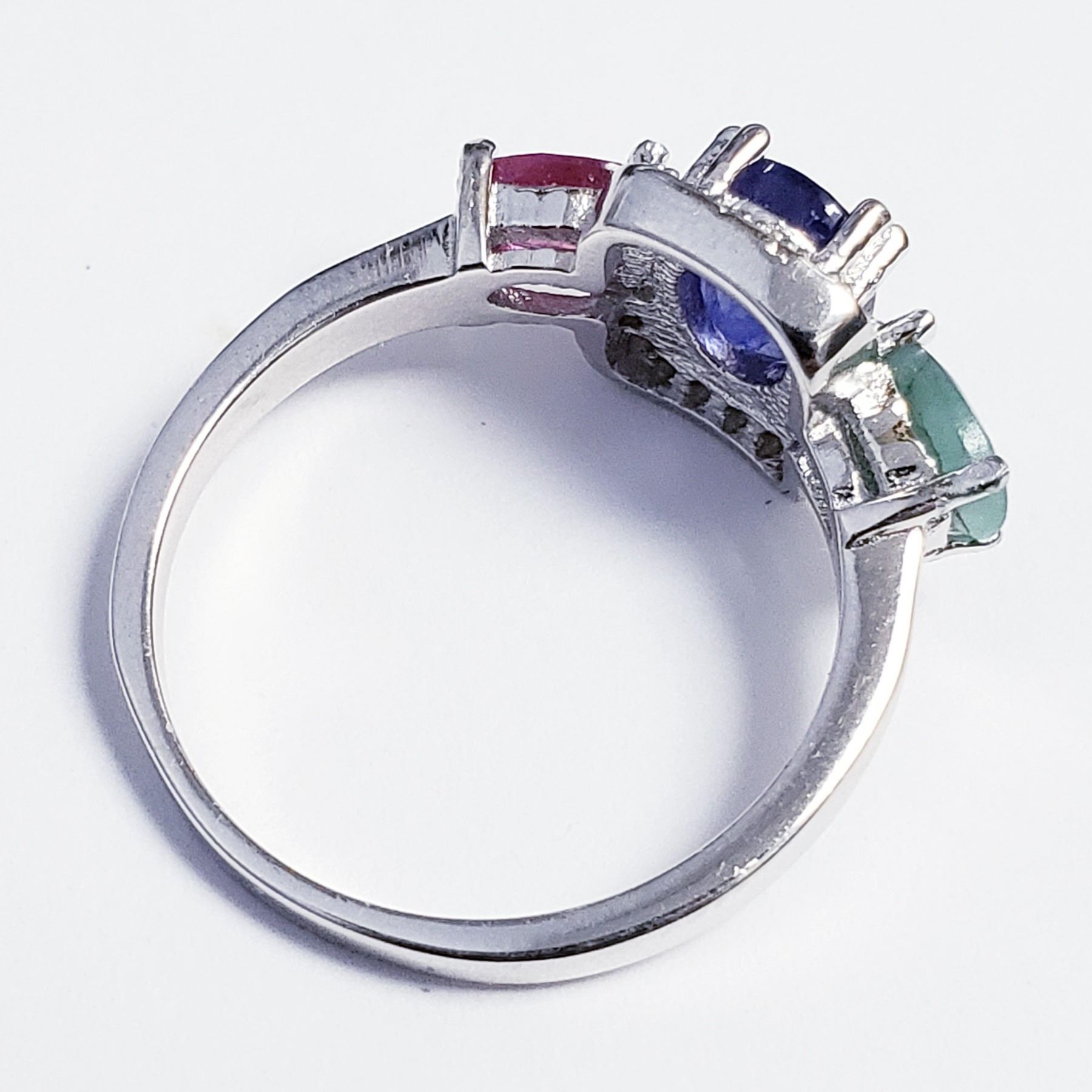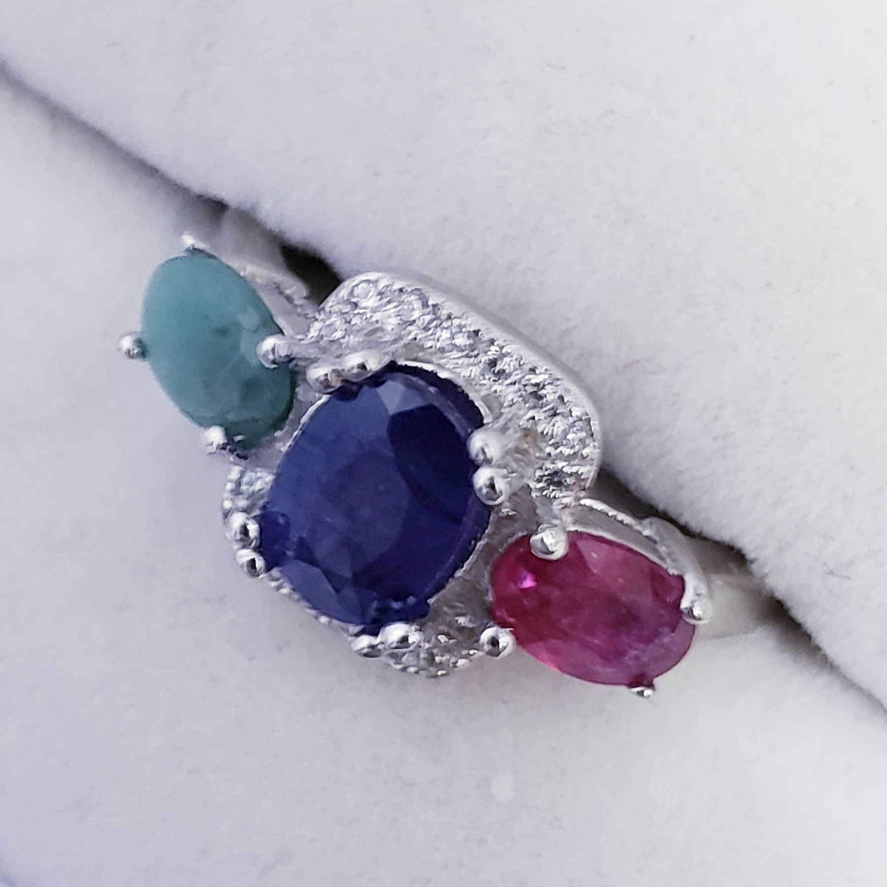 S. NO. 123 - DN49: SILVER SAPPHIRE EMERALD RUBY WITH CUBIC ZIRCONIA RING.