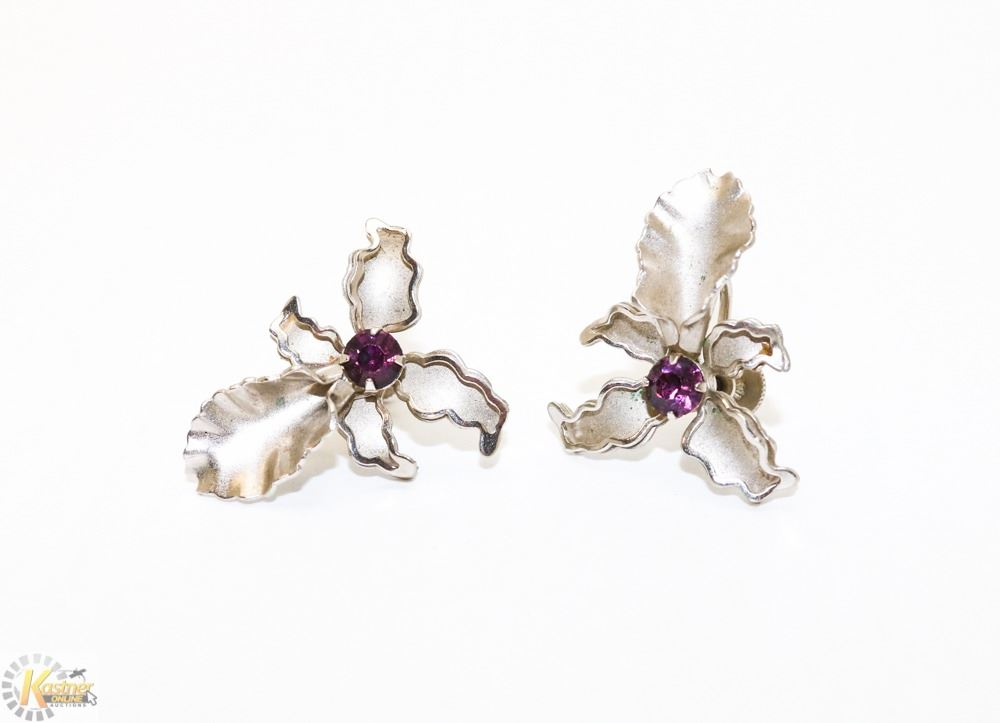 SILVER TONE IRIS SCREW BACK EARRINGS WITH PURPLE
