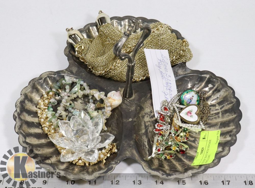SILVER TRAY WITH VINTAGE JEWELLERY.