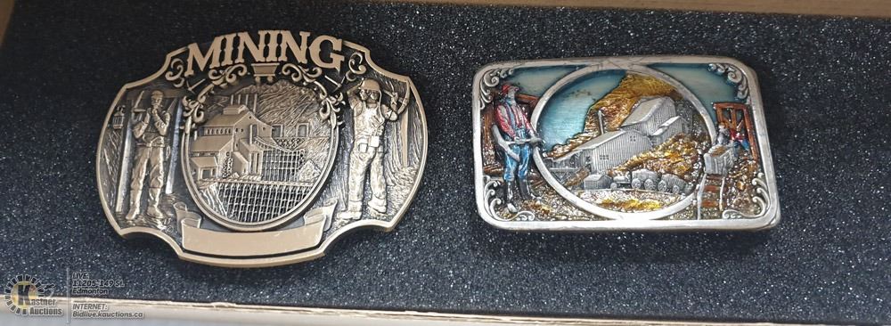 PEWTER BUCKLE (3.25" X 2") DATED 1983. SISKIYOU BUCKLE CO., WILLIAMS, OREGON LOGO ON BACK. HEAVY. OTHER MINING THEMED BELT BUCKLE IS SOLID BRASS (3.75" X 2.75") BY AWARD DESIGN MEDALS, INC-COLLECTIBLES