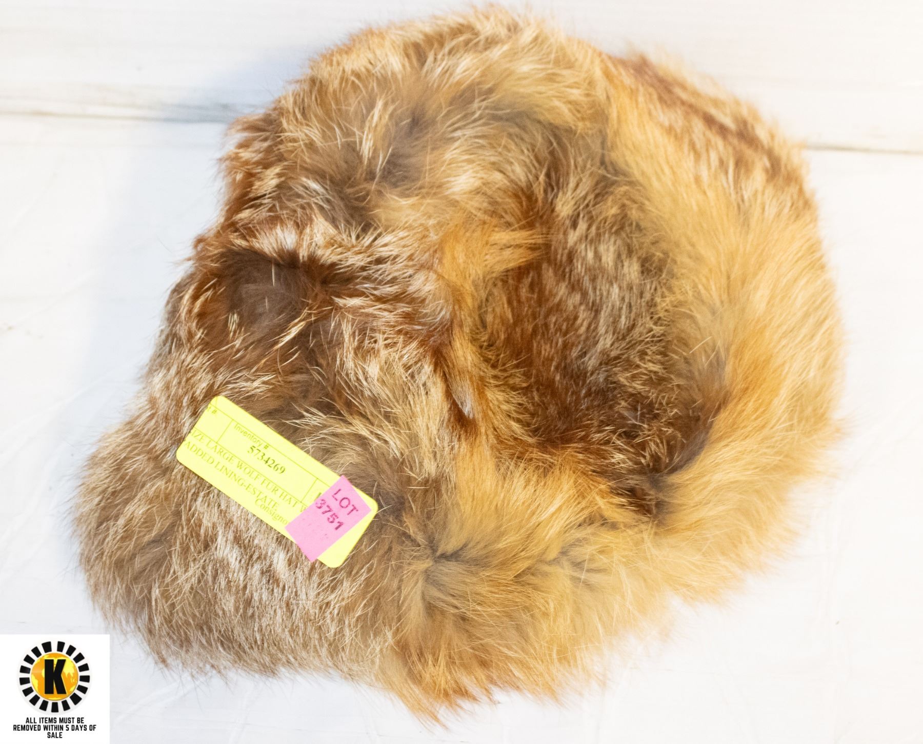 SIZE LARGE WOLF FUR HAT WITH PADDED LINING-ESTATE