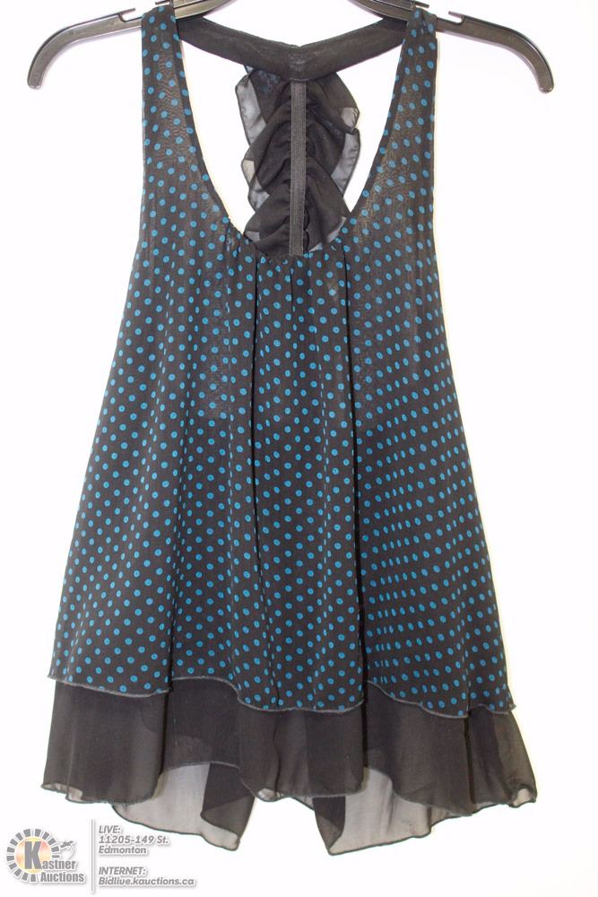 T-BAR OPEN BACK , BLACK WITH BLUE POLKA DOTS