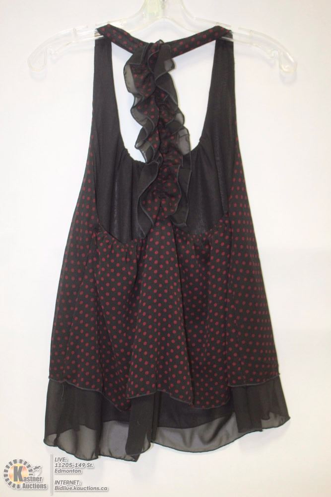 T-BAR OPEN BACK , BLACK WITH RED POLKA DOTS