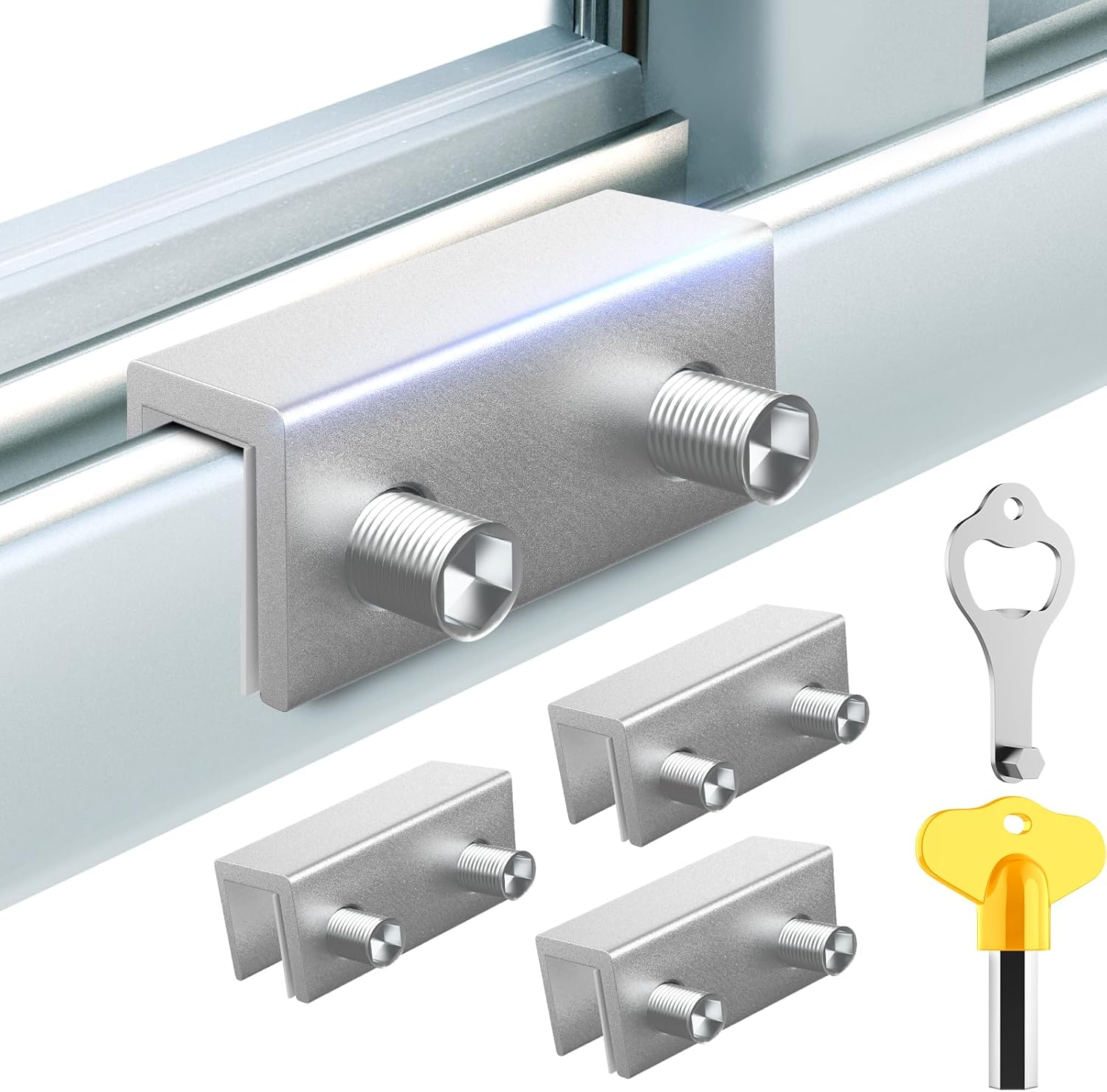 SLIDING WINDOW LOCK WITH KEY, 4 PCS SECURITY WINDOW LOCKS FOR UP AND DOWN WINDOW/HORIZONTAL SLIDING WINDOW SAFETY, CHILD PROOF SLIDING DOOR LOCK BAR VERTICAL WINDOW STOPPER EASY INSTALLATION SILVER