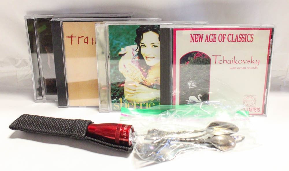 ARTISTS) / RED “MAGLITE”, SMALL, 6” LENGTH / SET OF 4 COMMEMORATIVE COLLECTORS SPOONS, DESCRIPTION OF EACH: LETHBRIDGE W/ QUEEN’S CROWN TIP SPOON. ALBERTA MAP SPOON. CALGARY TOWER SPOON. SUGAR SPOON W/ RAISED MOTIF ON HANDLE SPOON. PORCELAIN WHITE W/ PURPLE ORCHID HANDLE FORK.
