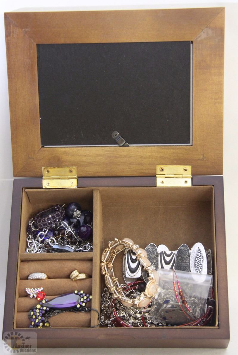 SMALL BROWN JEWELRY BOX WITH CONTENTS