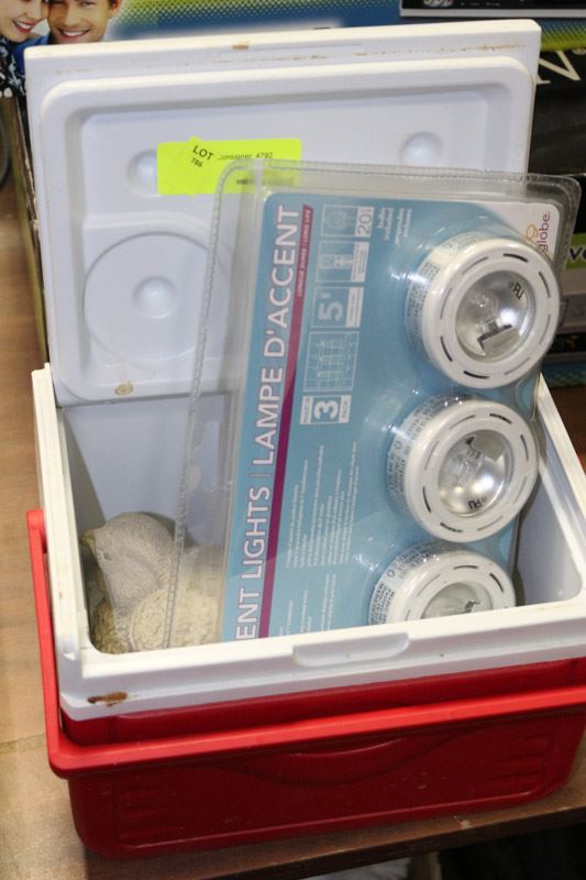 SMALL COOLER W/ ORNAMENTS AND ACCENT LIGHTS