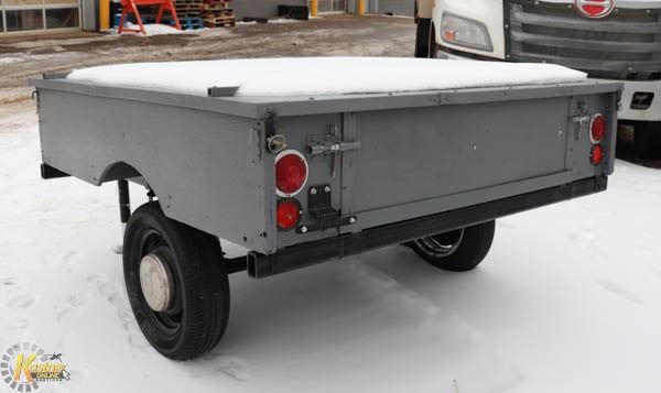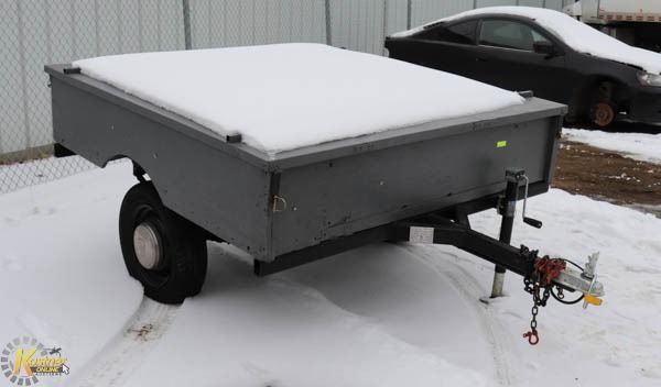 WELDED STEEL 2X3 BOX FRAME, STEEL COVER WITH 4 LOCK POINTS, NEW HEAVY COPPER WIRING, FLAT PIN ELECTRICAL CONNECTION, 15" STEEL RIMS & TIRES, DOUBLE SHOCK ABSORBERS, FOLD AWAY LEVELER, 3 COMPARTMENT INTERIOR, SPARE TIRE, NEW LOCKABLEBALL HITCH, PADLOCK SECURITY. VIN#ISWUW10A8240, KEYS ON TAG #116 AT FRONT DESK.
