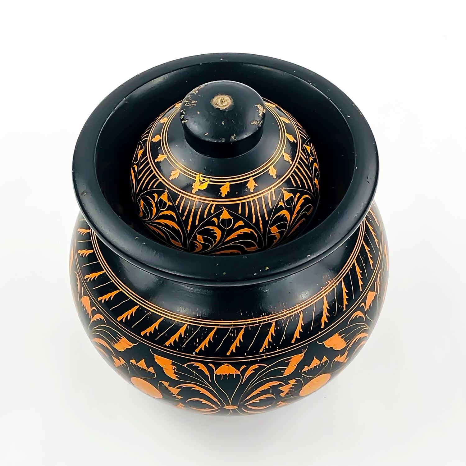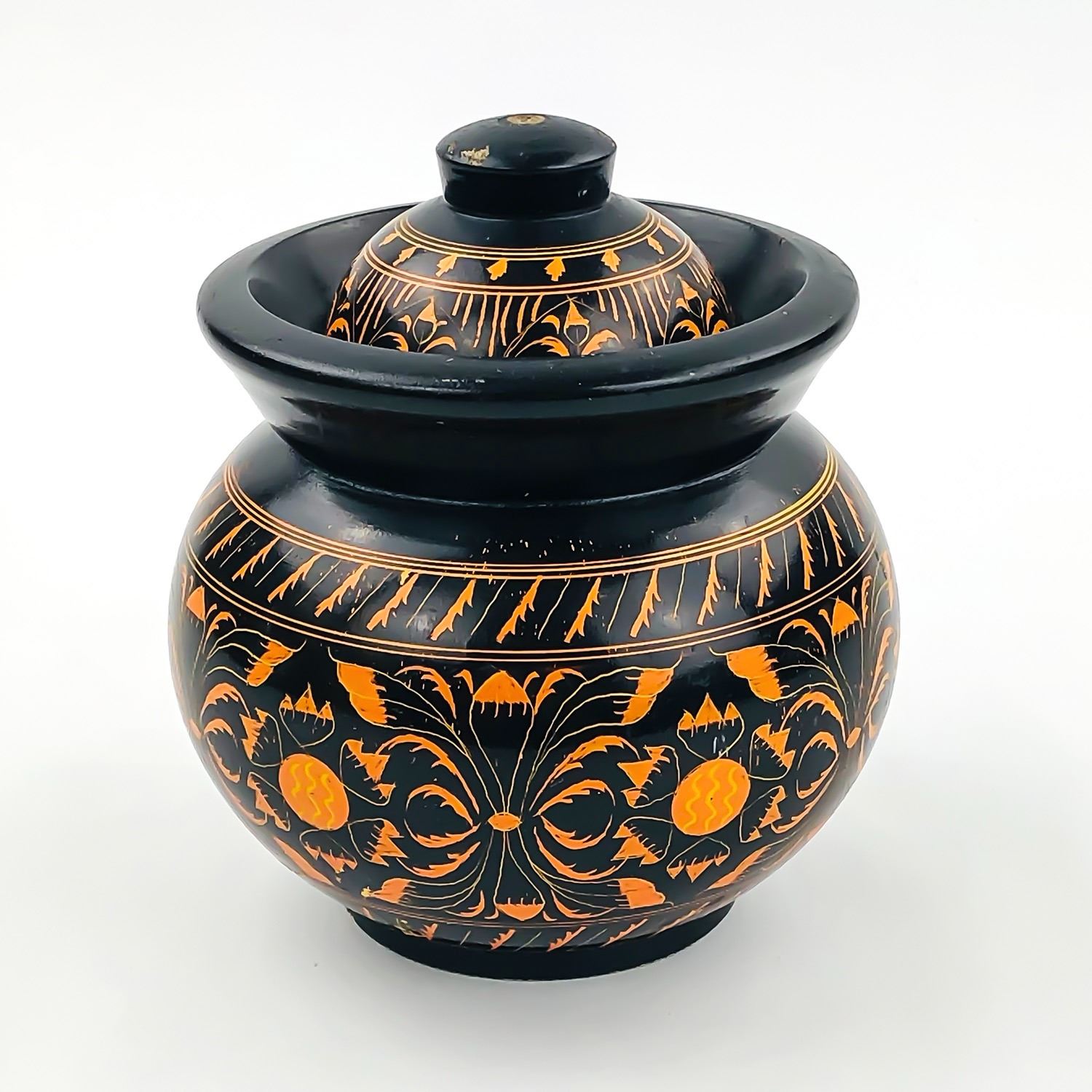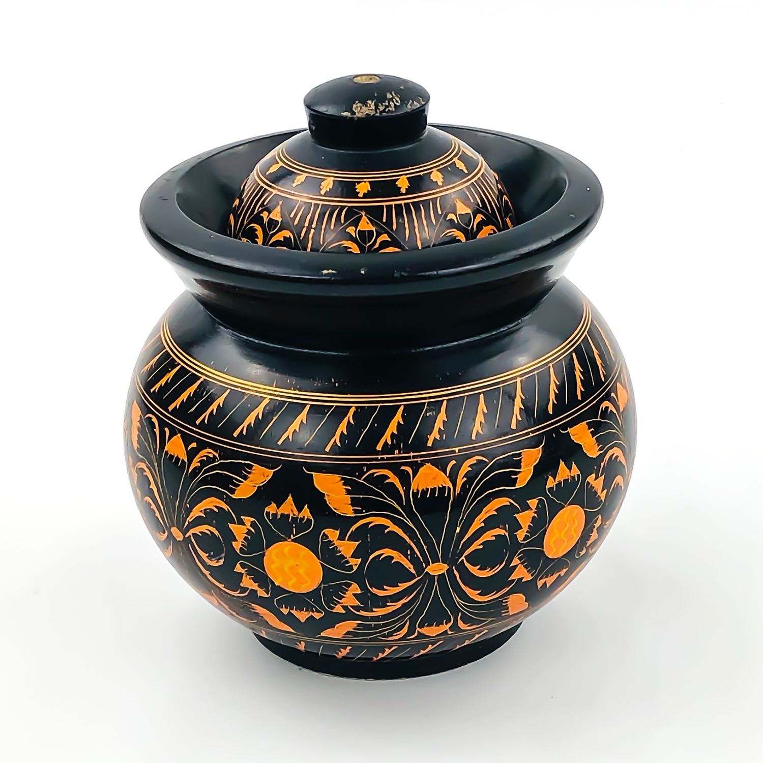 #8643 - FLORAL DESIGN OUTLINES ARE LIGHTLY CARVED INTO THE WOOD, THEN PAINTED. MEASURES: 5.25” (13.5 CM) HIGH BY 4.5” (11.5 CM) WIDEST DIAMETER AND 2” (5 CM) TOP OPENING DIAMETER***ITEM(S) LOCATED IN LETHBRIDGE ALBERTA. FREE TRANSPORT TO EDMONTON OFFICE AVAILABLE FOR THIS AUCTION. WORLDWIDE SHIPPING IS AVAILABLE FOR ALL ITEMS