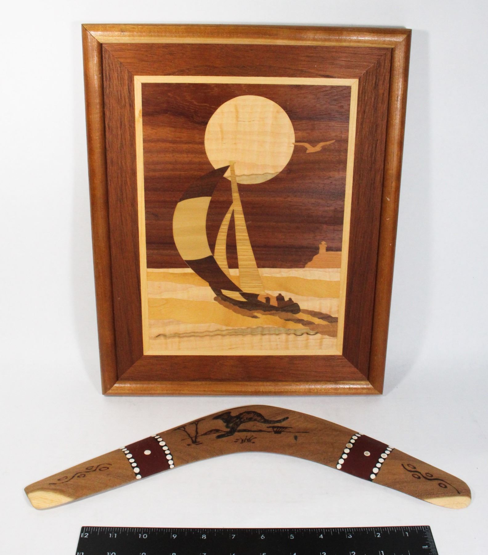 ARTIST SIGNED BOOMERANG AND INLAID WOOD ARTWORK (12" X 15")