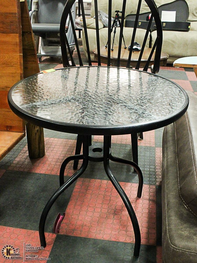 SMALL METAL AND GLASS PATIO TABLE, 27" DIAMETER