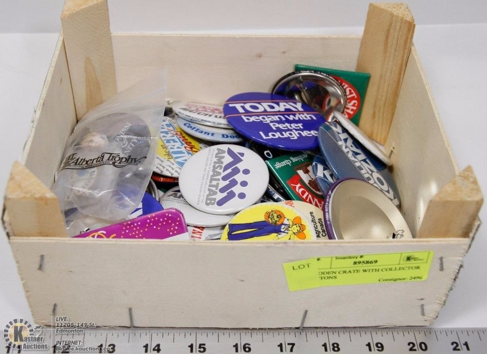 SMALL WOODEN CRATE WITH COLLECTOR BUTTONS