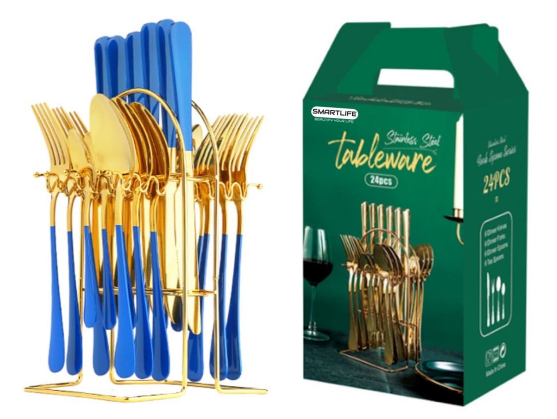 SERVING FOR 6, GOLD STAND, ELEGANT CUTLERY, MIRROR POLISH, TOUGH TITANIUM FINISH (BLUE & GOLD) **ALL ITEMS MUST BE REMOVED BY 5PM MONDAY, MAY 8TH, 2023. ALL REMAINING ITEMS WILL BE SUBJECT TO A $6.00 PER DAY STORAGE CHARGE. ANY ITEMS REMAINING AFTER MONDAY, MAY 22ND, 2023 WILL BE CONSIDERED FORFEITED. NO REFUNDS WILL BE ISSUED FOR FORFEITED ITEMS.** TO SCHEDULE A PICK UP APPOINTMENT CLICK HERE