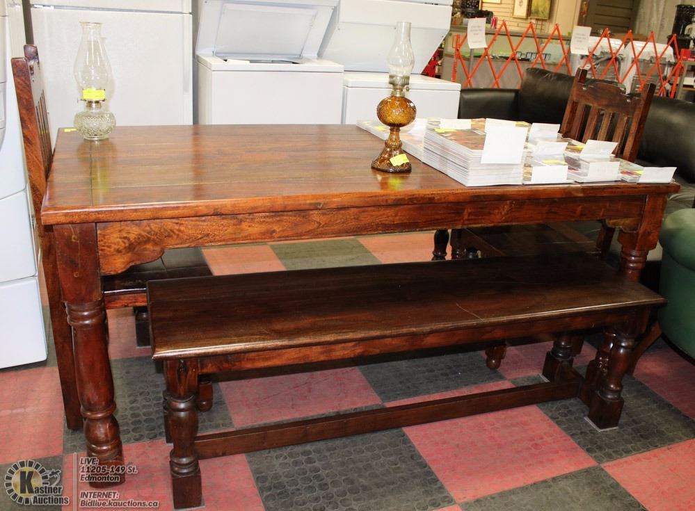 2 CHAIRS AND 2 BENCHES (TABLE: 71"L X 36"W X 31"H) (BENCHES: 57"L X 16"H)