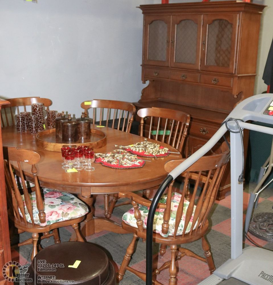 WITH 2 LEAVES AND 6 CHAIRS TABLE: 71"X48":X30"H BUFFET AND HUTCH: 56"X18"X77"H