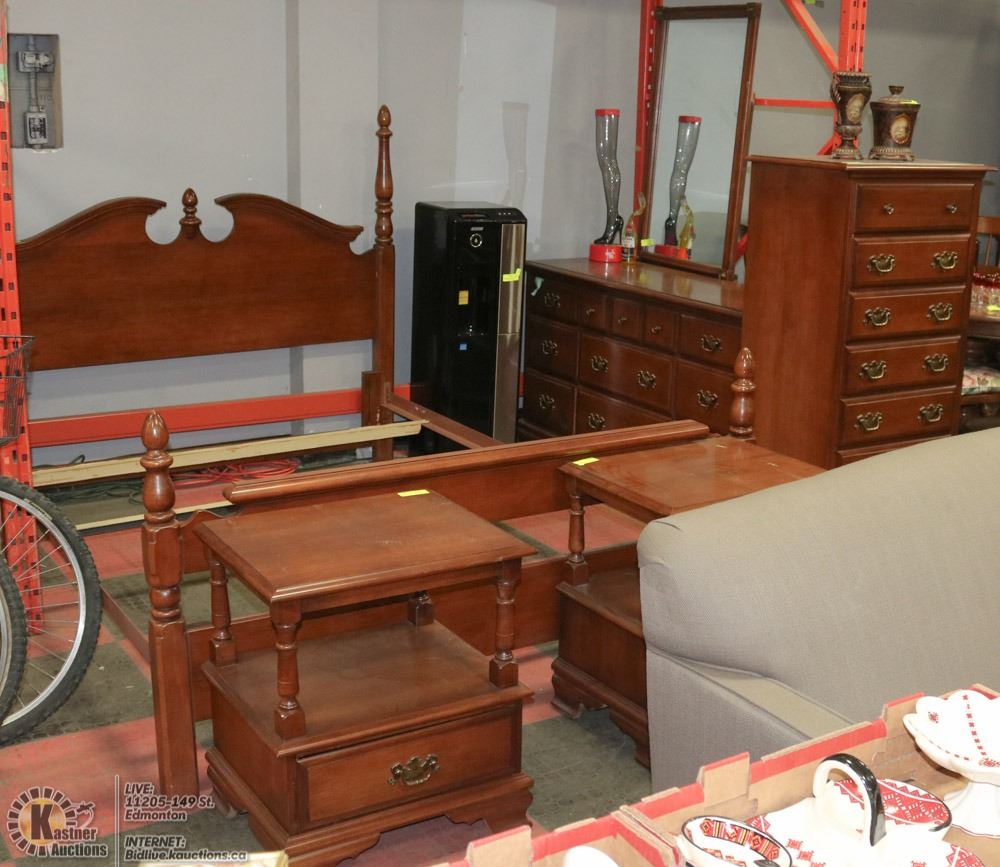INCL HEADBOARD, FOOTBOARD, RAILS, 2 NIGHT STANDS, LINGERIE CHEST, AND DRESSER WITH 2 MIRRORS,