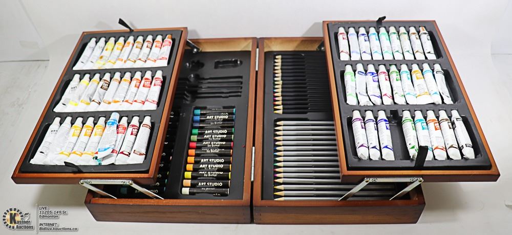 FOLD-OPEN TWO-TRAY WOOD STORAGE - HOLDS 54 PAINT SLOTS - ACRYLIC, 30 QUALITY COLOUR PENCILS, 24 BATTAT PASTELS, SKETCH PENCILS, ETC. - GENERAL, ART