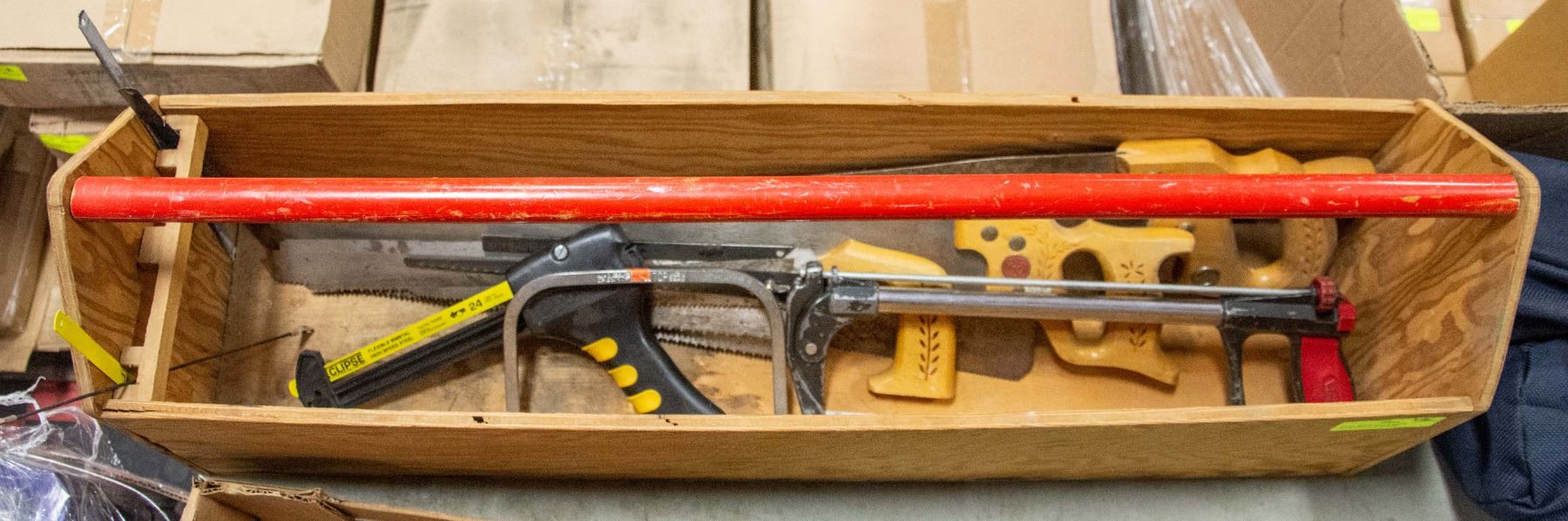 (32.5"L X 8.5"W X 12"H) WITH 10 VARIOUS TYPES OF HAND SAWS AND EXTRA BLADES - 2 TYPES OF HACK SAWS, COPING SAW, 5-IN-ONE SAW WITH INTERCHANGEABLE BLADES, 26 INCH & 31 INCH HAND SAWS