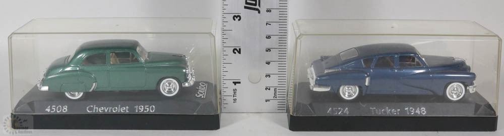 SEDAN. IN DISPLAY CASES. MADE IN FRANCE. 1948 TUCKER TORPEDO (#4524 ) & 1950 CHEVROLET SEDAN (#4508)