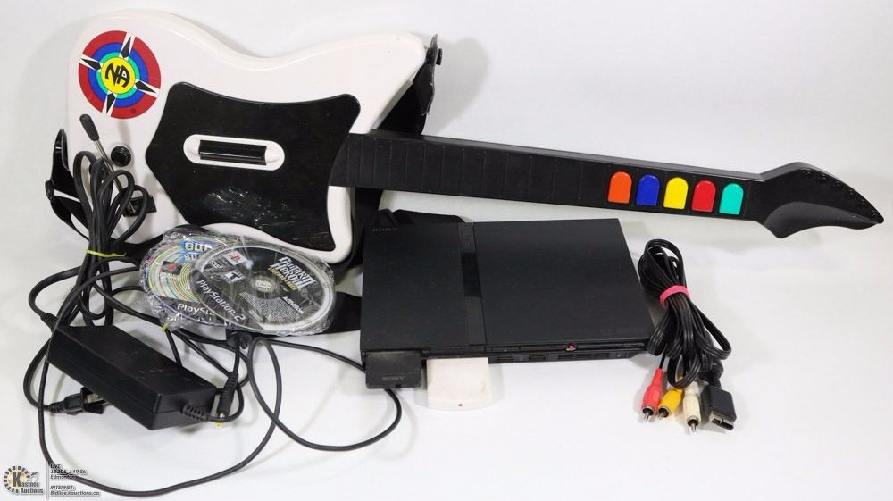 SONY PLAYSTATION 2 WITH GAMES AND GUITAR