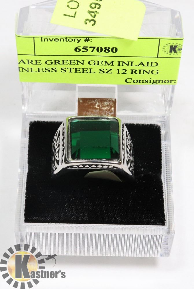 SQUARE GREEN GEM INLAID STAINLESS STEEL SZ 12 RING