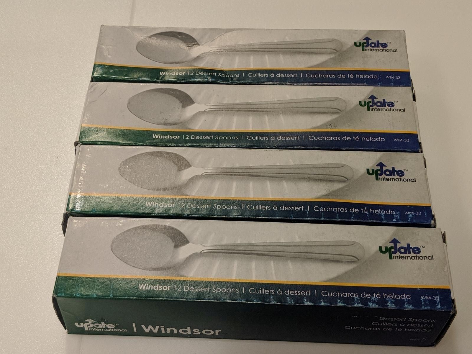 K673 NEW STAINLESS DESSERT SPOONS, WINDSOR SERIES - LOT OF 48