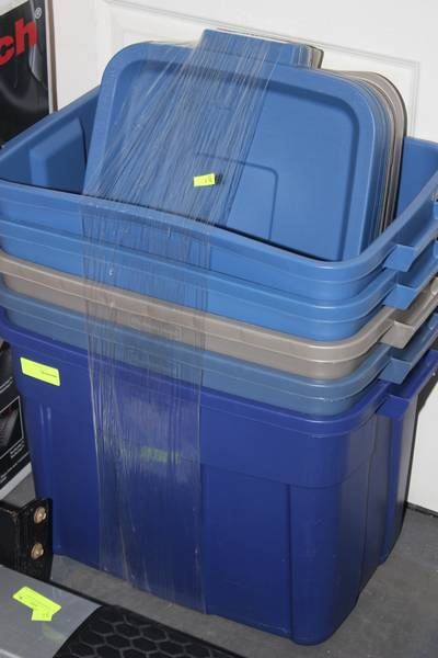 STACK OF 5 RUBBERMAID TOTES