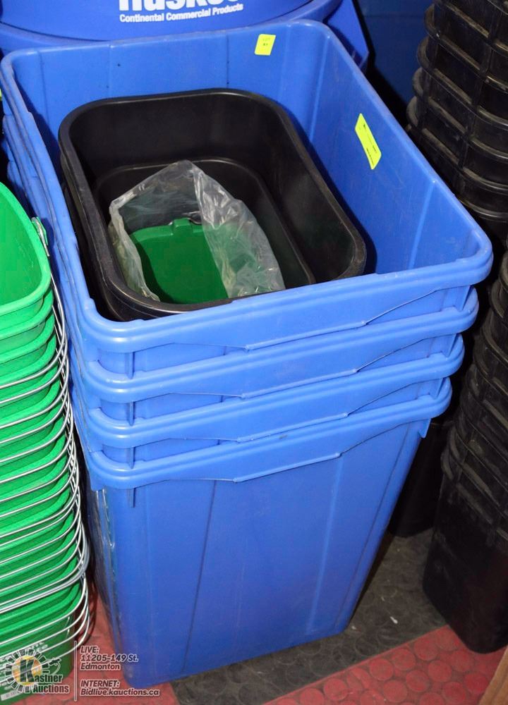 STACK OF ASSORTED RECYCLE AND GARBAGE BINS