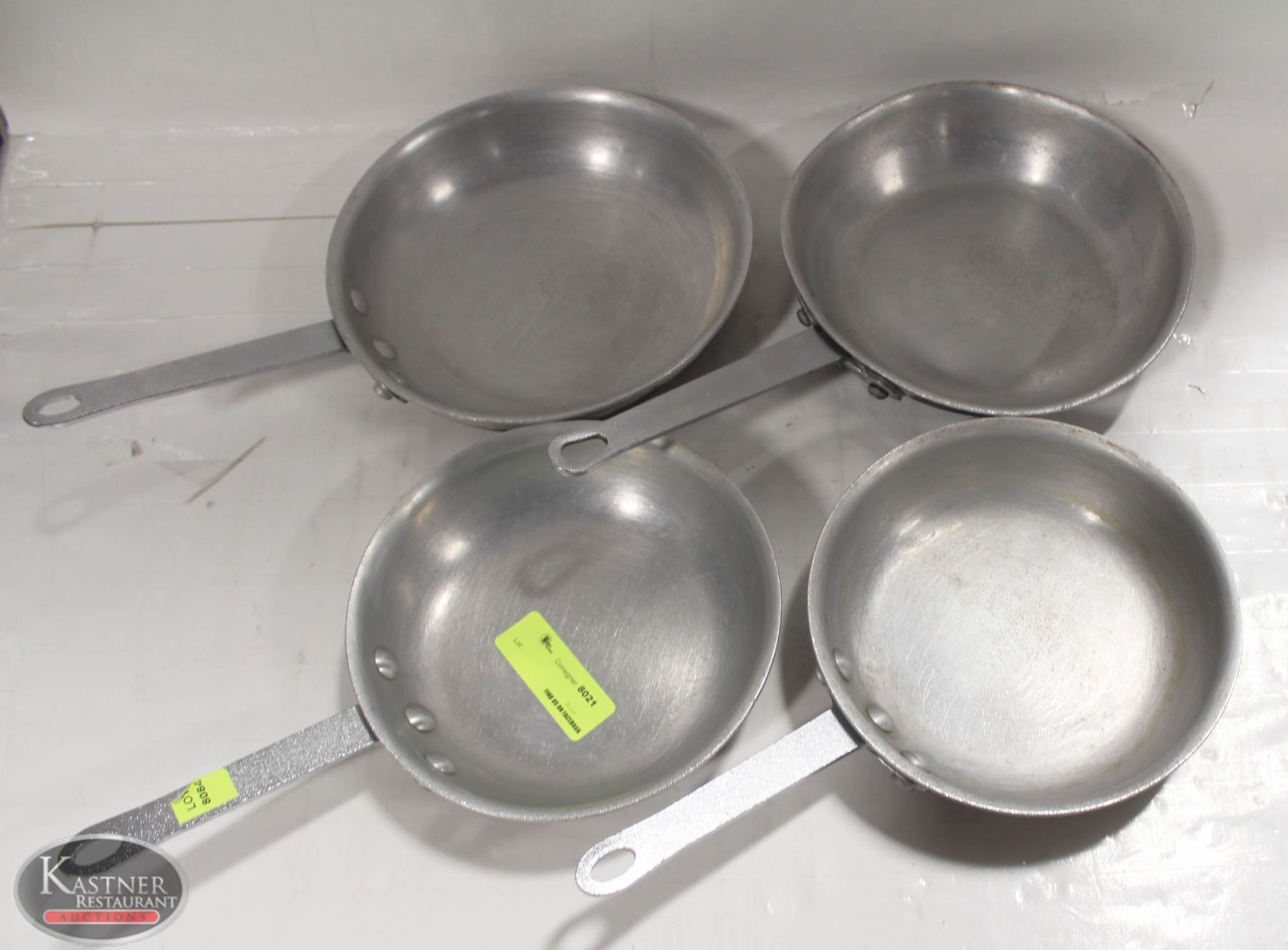 STACK OF FOUR ALUMINUM FRYING PANS, ASSORTED SIZES