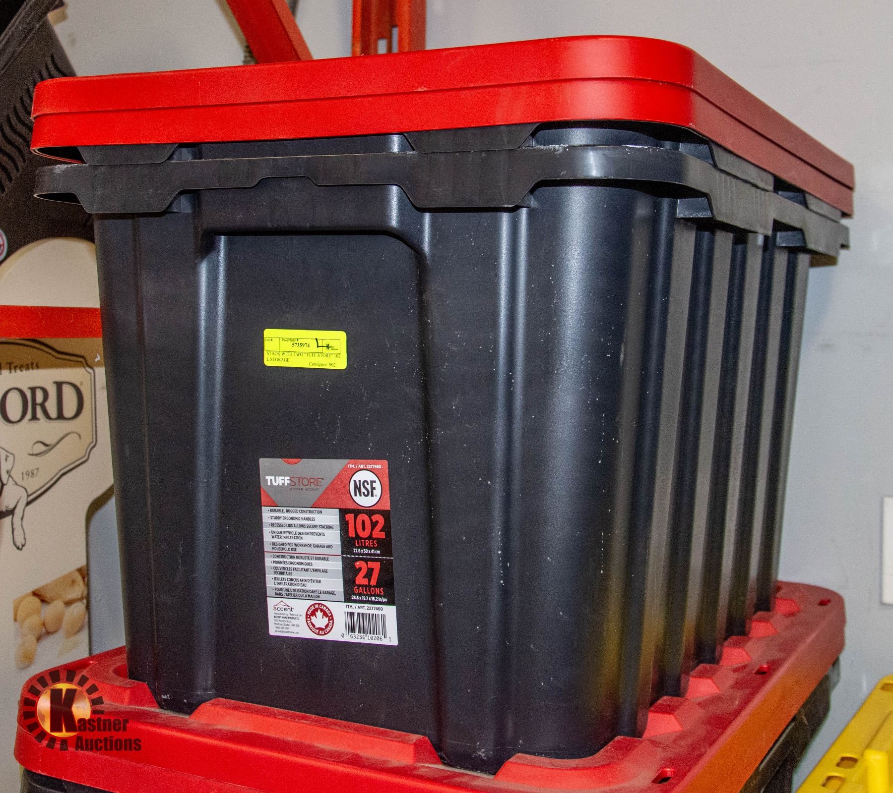 TOTES - HEAVY DUTY BLACK NYLON PLASTIC WITH TWO RED SNAP-DOWN LIDS, STACKABLE, NESTING, BUILT-IN HANDLES **ALL ITEMS MUST BE REMOVED BY 5PM SATURDAY, DECEMBER 9TH 2023. ALL REMAINING ITEMS WILL BE SUBJECT TO A $6.00 PER DAY STORAGE CHARGE. ANY ITEMS REMAINING AFTER THURSDAY, DECEMBER 21ST 2023 WILL BE CONSIDERED FORFEITED. NO REFUNDS WILL BE ISSUED FOR FORFEITED ITEMS. TO SCHEDULE A PICK UP APPOINTMENT CLICK HERE