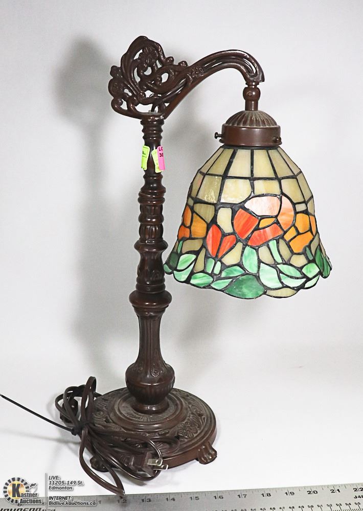 STAINED GLASS TABLE LAMP. GREEN, ORANGE AND TAUPE