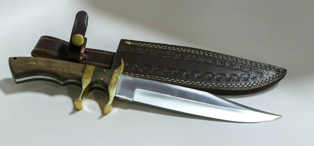 STAINLESS BOWIE KNIFE, WALNUT & BRASS HANDLE WITH
