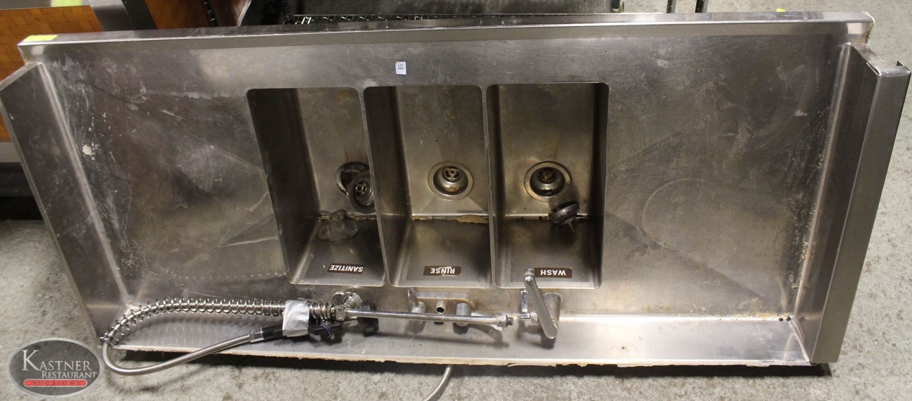 PRE-RINSE, BACKSPLASH & SIDESPLASHES. *NO LEGS* WELLS ARE 9.25"X20"X11" DEEP. OVERALL DEMENSIONS: 66"X28"X17" W/ 6" BACKSLASH & SIDESPLASHES