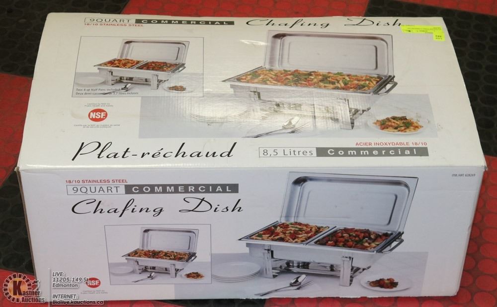 CHAFING DISH SET - CONTAINS TWO 4 QT. HALF PANS & ONE 9 QT. PAN & STANDS - HOUSEHOLD