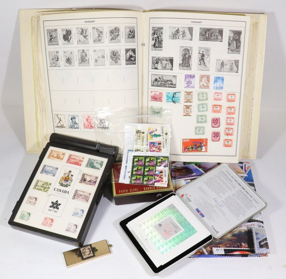 BOOK (NOT ALL FULL) CANADA CENTENNIAL STAMP HOLDER 1867-1967 CASE W/STAMPS, 2 VINTAGE STAMP HOLDERS, 1999 CANADA POST COIN/STAMP, CANADA STAMPS UNUSED.MORE