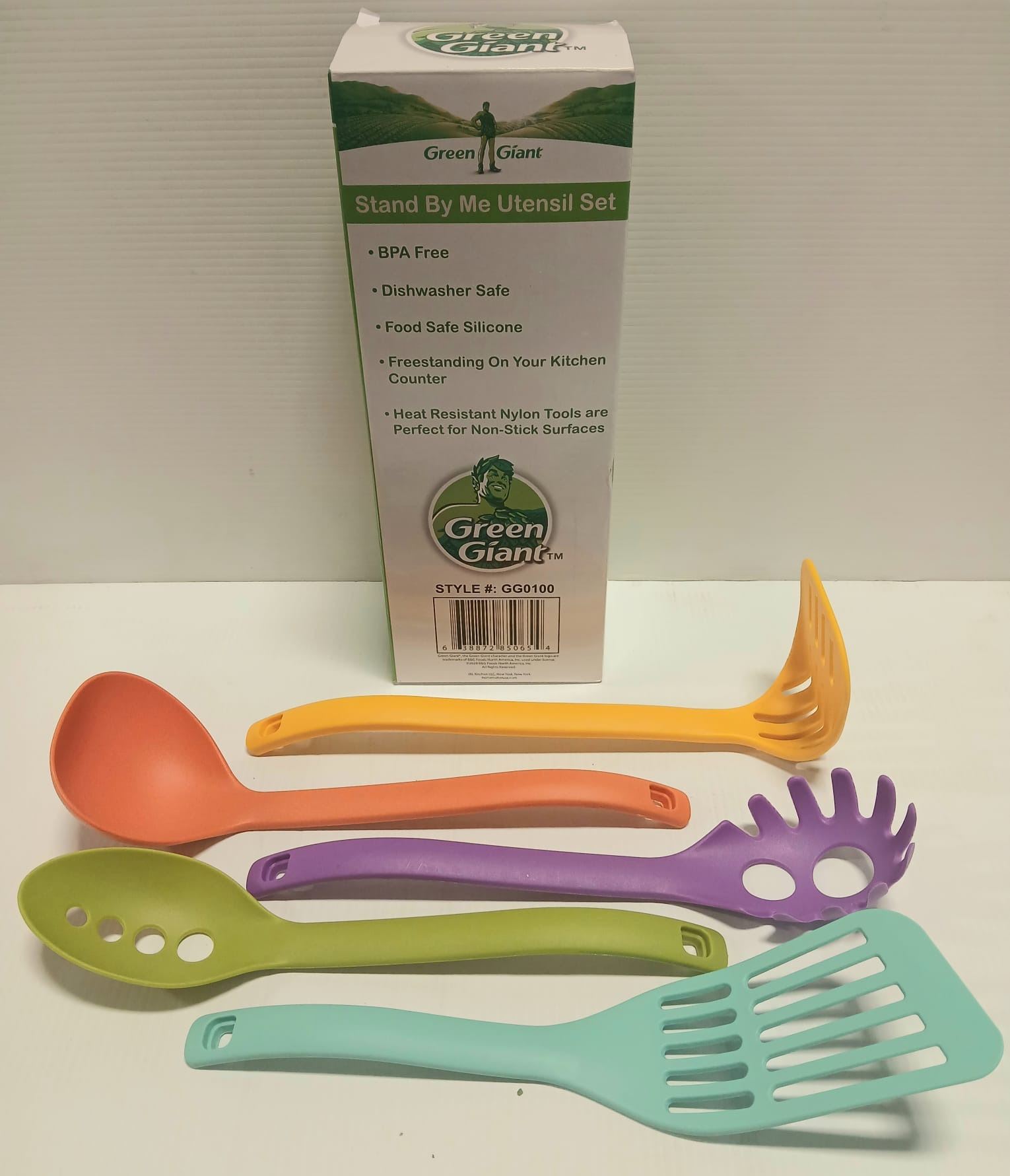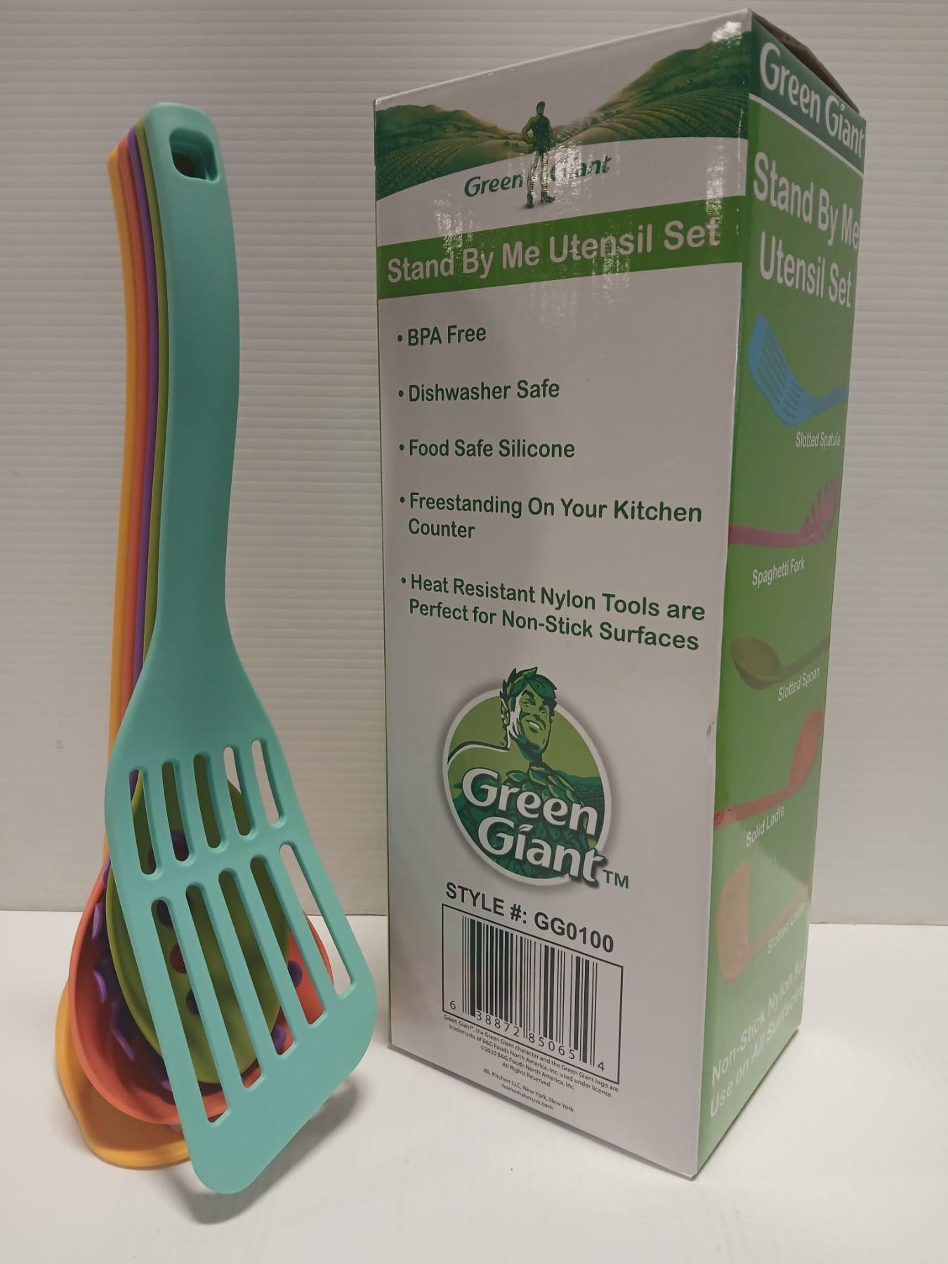 STANDING 5 PIECE NYLON COOKING UTENSIL SET SLOTTED SPATULA, SPAGHETTI FORK, SLOTTED SPOON, SOLID LAD
