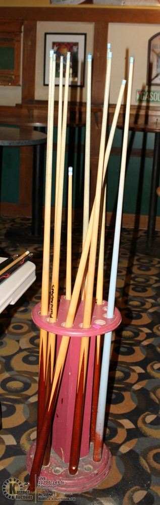 STANDING WOOD POOL CUE RACK WITH 9 POOL CUES