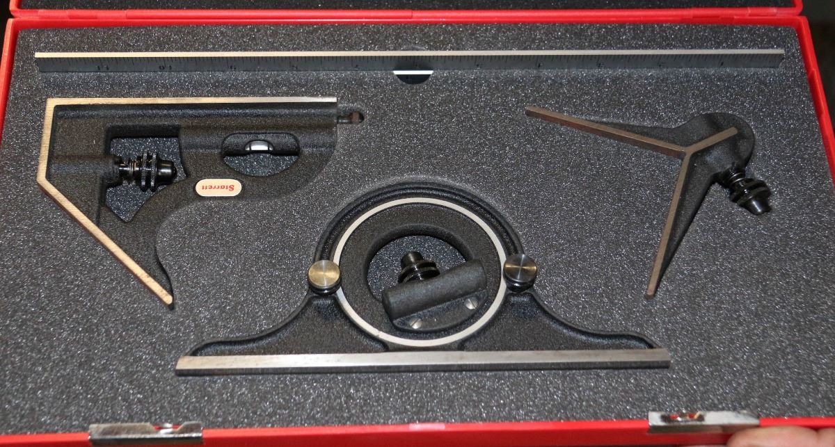 CENTER, AND REVERSIBLE PROTRACTOR HEAD & BLADE - INCLUDES CAST IRON HEAD WITH BLACK WRINKLE FINISH & FEATURES REVERSIBLE LOCK BOLTS, SCRIBER, SPIRIT LEVER IN BOTH SQUARE HEAD & PROTRACTOR HEAD, DIRECT READING DOUBLE 180 DEGREE PROTRACTOR SCALE,