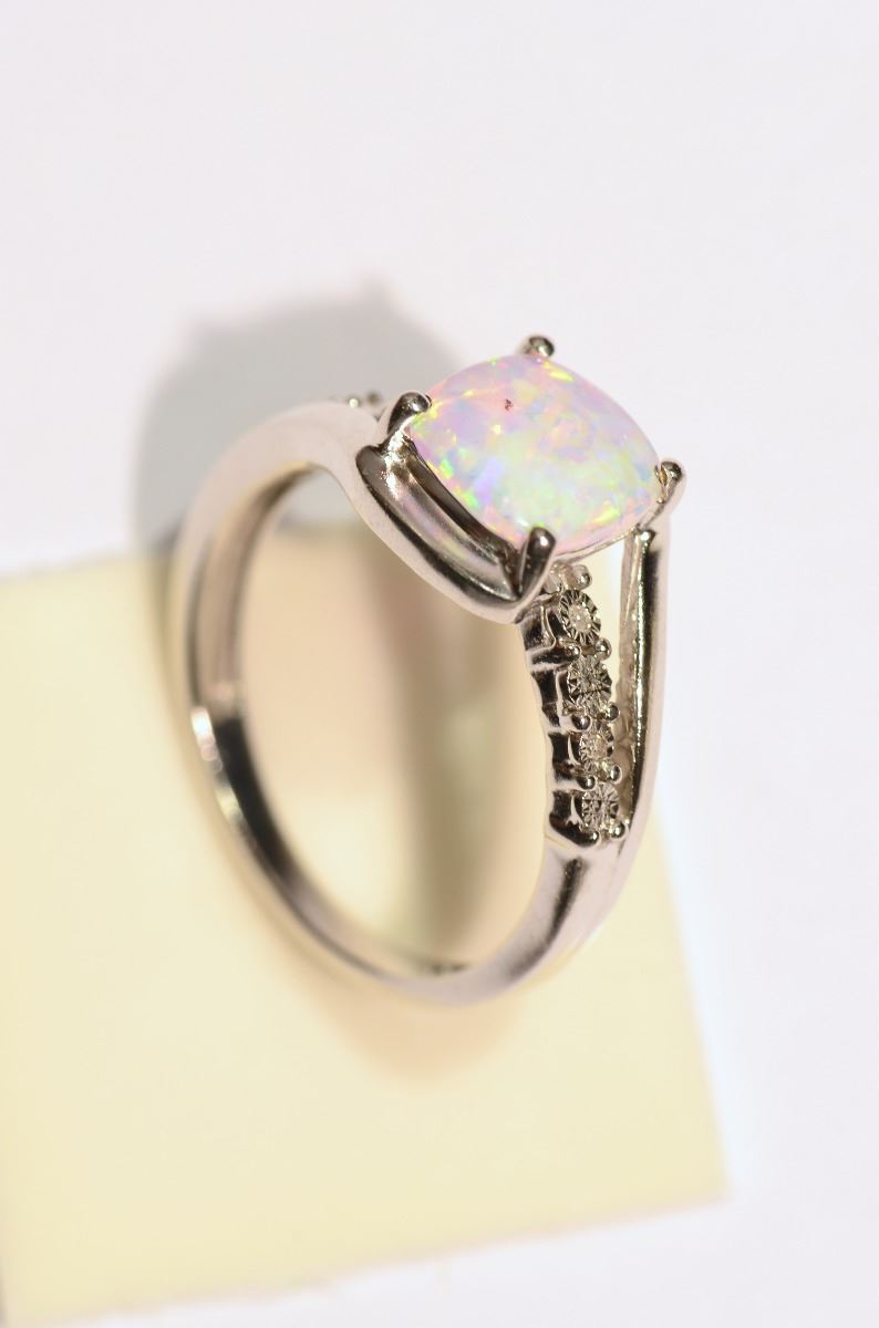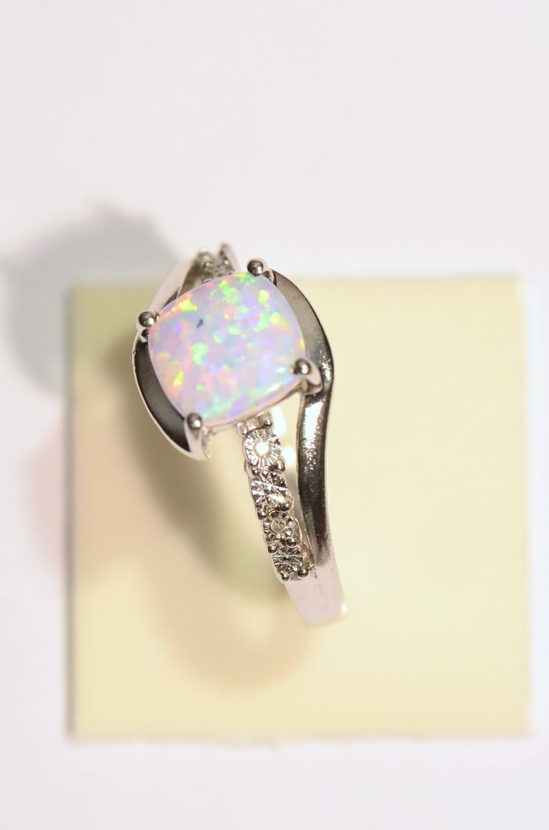 STERLING SILVER CREATED OPAL & DIAMOND RING