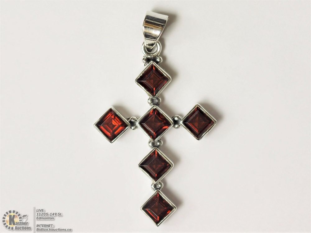 (#11- NN3):STERLING SILVER GARNET CROSS SHAPED PENDANT