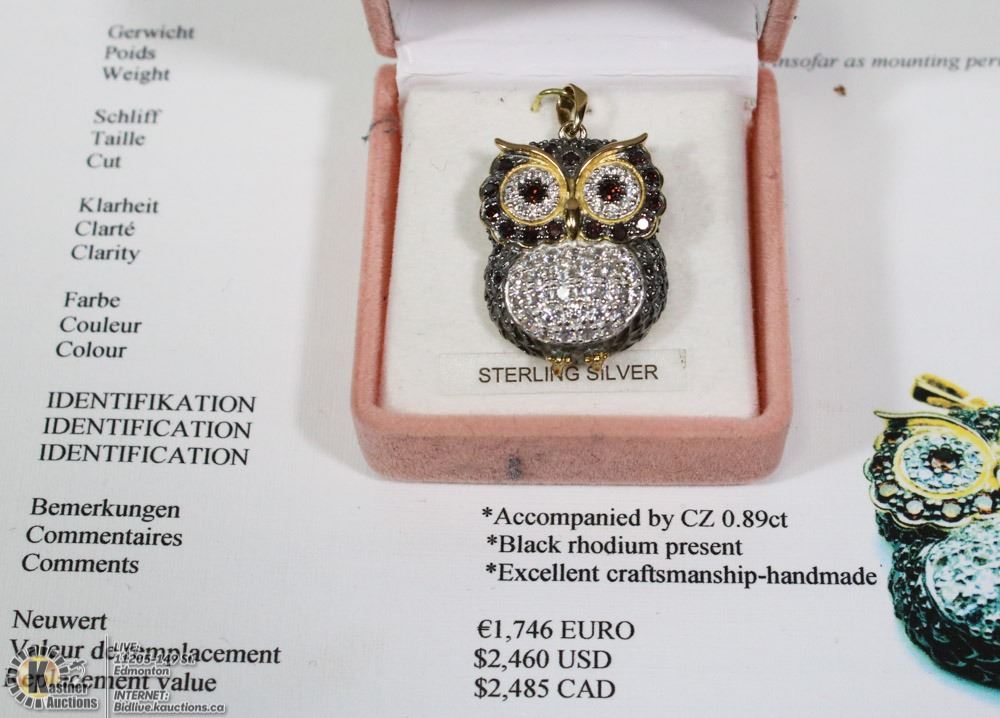.925 GOLD PLATED NATURAL GARNET WITH CZ (0.89CT) OWL . SUGGESTED REPLACEMENT VALUE $2485.00CAD