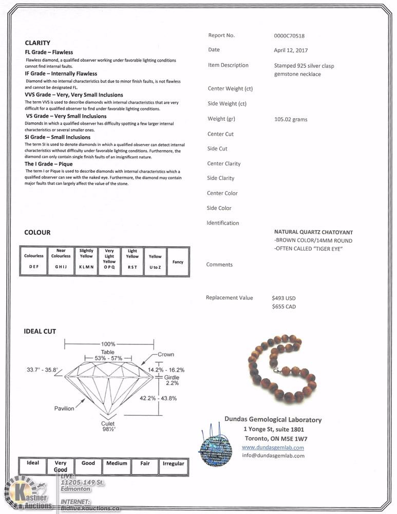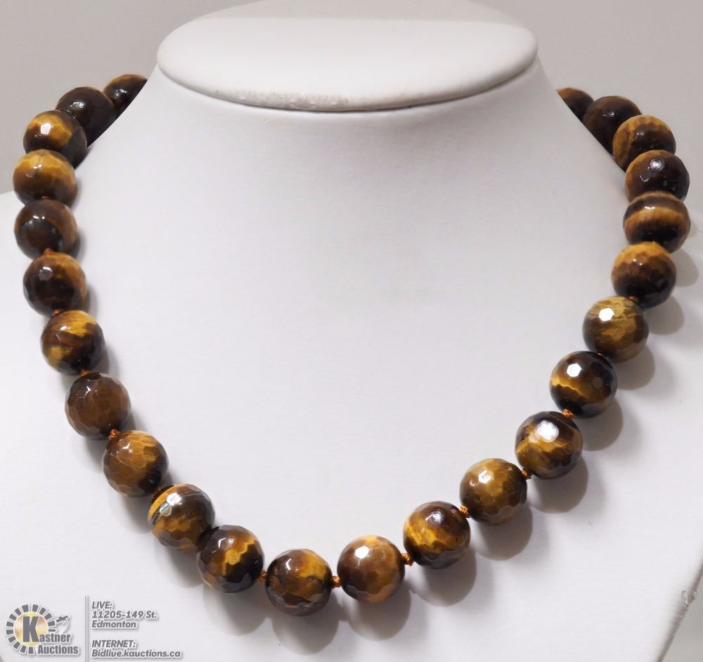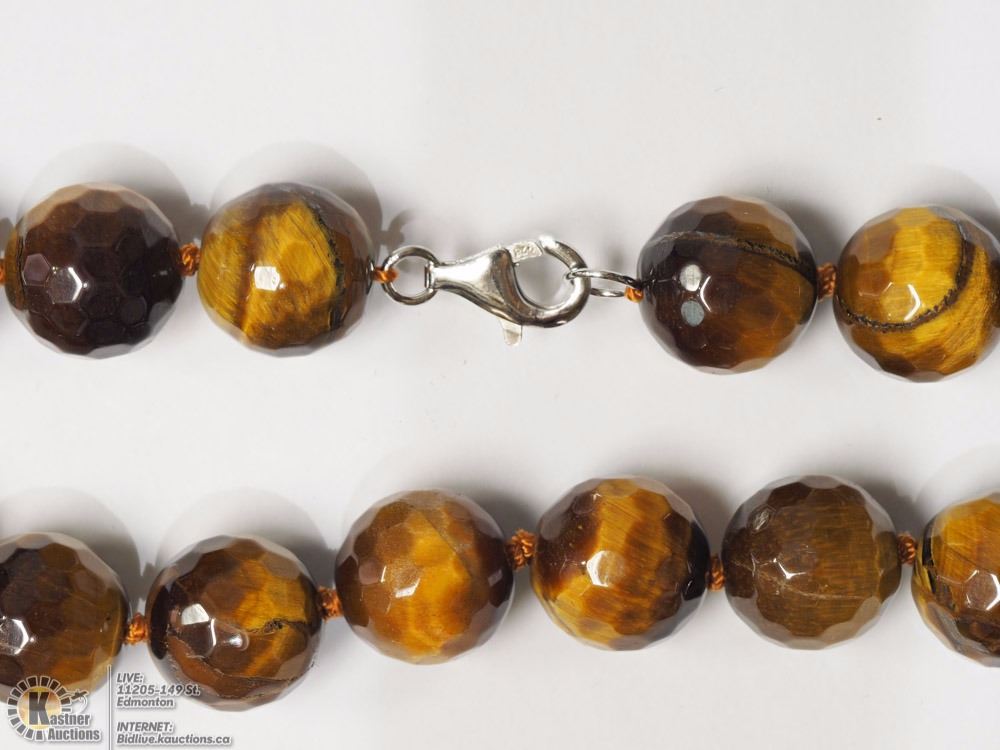 (50 - NN4): STERLING SILVER TIGER EYE(14MM)NECKLACE W/ COA - SUGGESTED REPLACEMENT VALUE $655.00