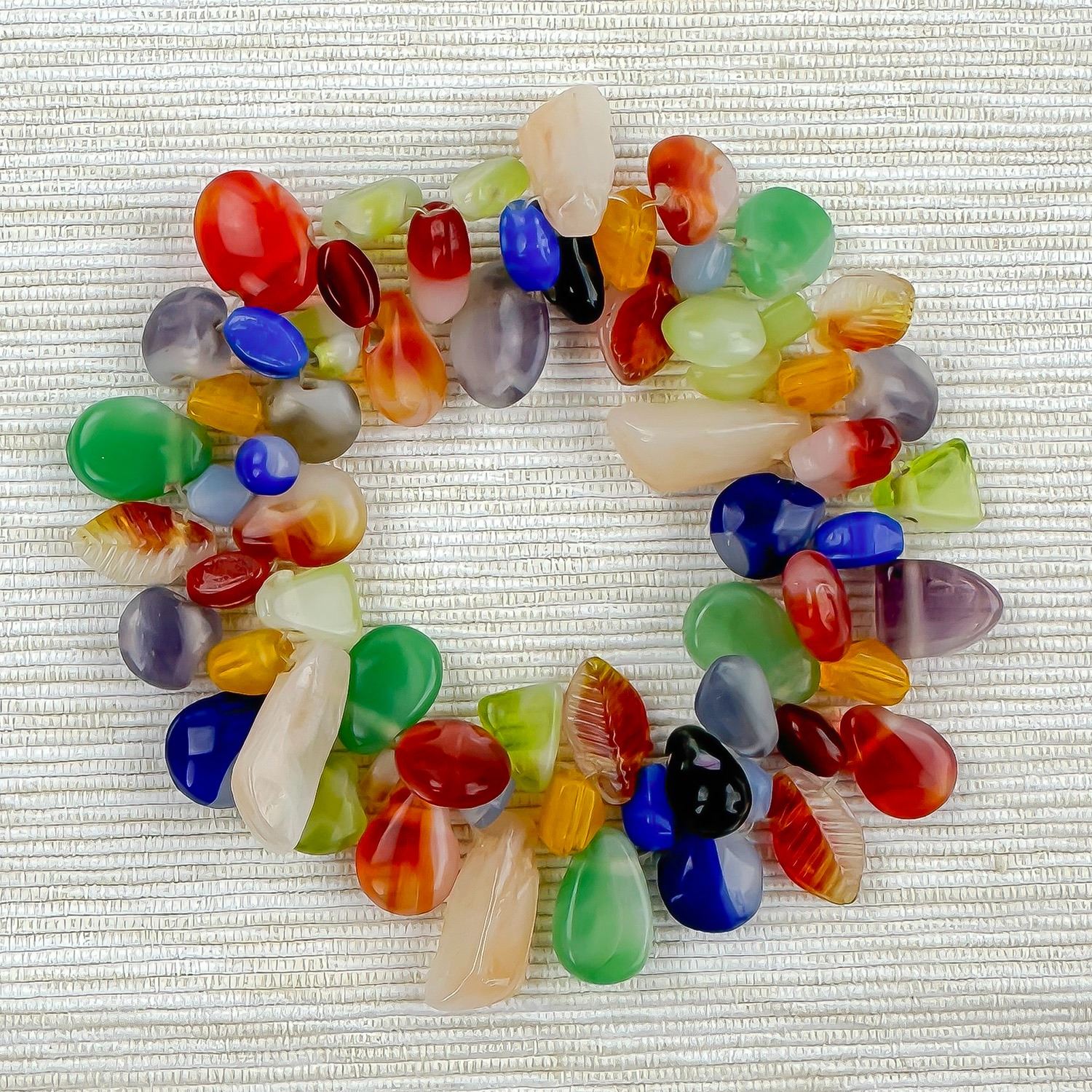 #8693 - MULTI-COLOR GEMSTONE OR STONE CHIP ELASTIC STRETCH COSTUME JEWELRY BRACELET. THEY APPEAR TO BE STONE CHIPS, BUT COULD BE SYNTHETIC - EITHER WAY, AN INTERESTING BRACELET WITH SOME CHIPS IN THE SHAPE OF LEAVES. MEASURES ROUGHLY 4” (10 CM) UN-STRETCHED