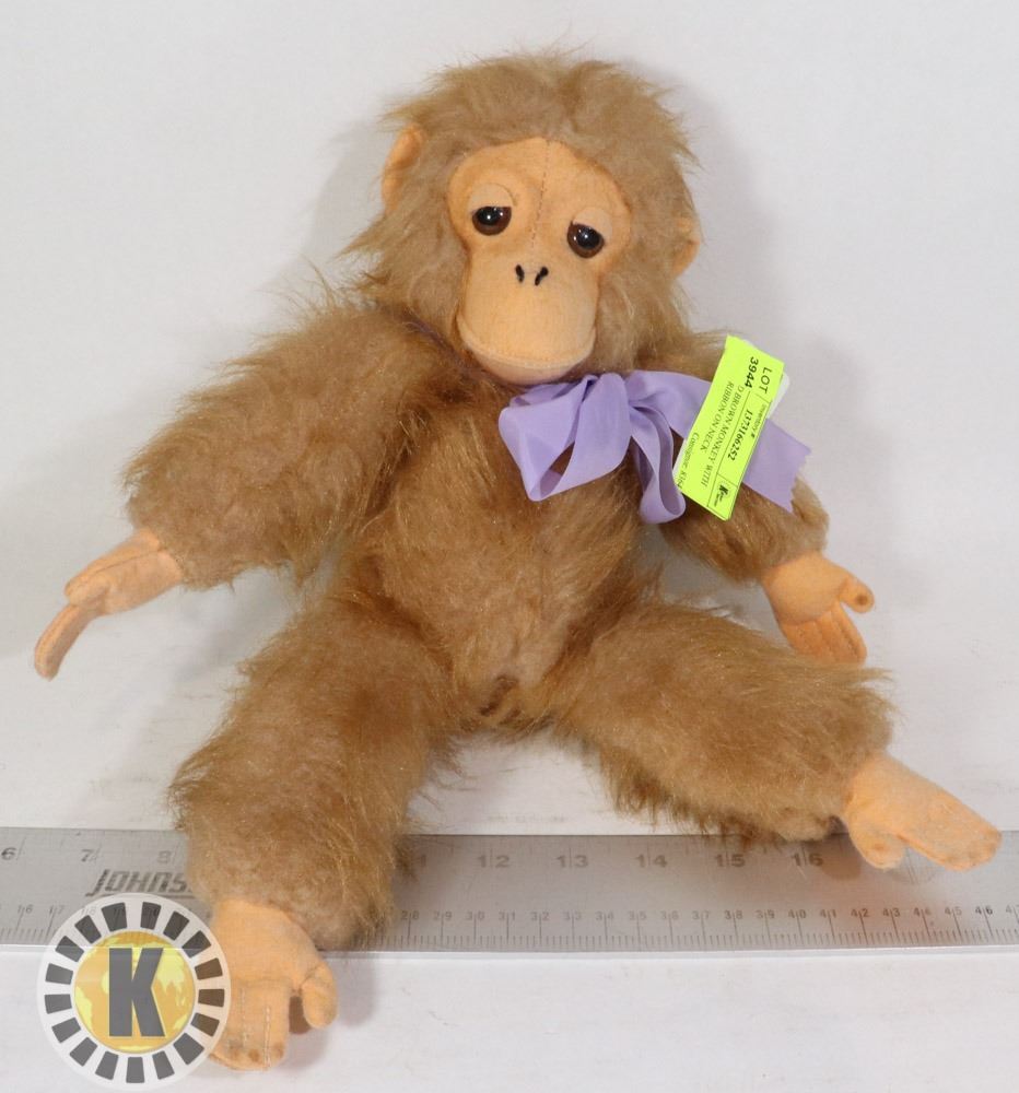 STUFFED BROWN MONKEY WITH PURPLE RIBBON ON NECK