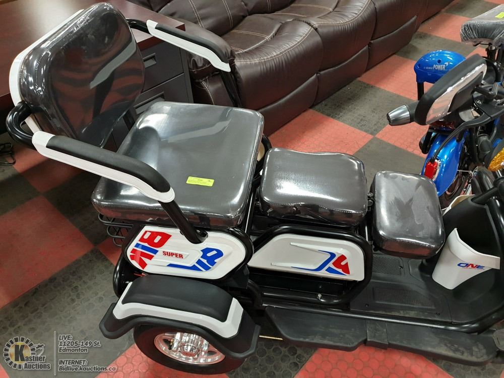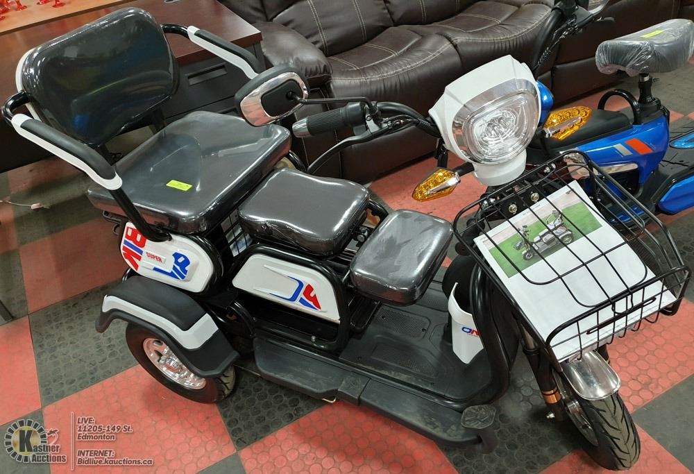 EXCELLENT OPTION FOR THE PHYSICALLY CHALLENGED. SEATING CONVERTS FROM SINGLE PERSON MODE TO MULTI PERSON IN SECONDS AND CAN HAUL 2 ADULTS AND A CHILD. 48V/60V - 500 WATT ELECTRIC MOTOR. 48V X 20AH BATTERY ELECTRIC MOTOR WITH MAXIMUM POWER OF 500 WATTS FORWARD AND REVERSE TOP SPEED OF 35KM/H AND DRIVES APPROXIMATELY 3KMS FRONT AND REAR HEAVY DUTY DRUM BRAKES. FRONT AND REAR BASKETS WITH HD FRONT BASKET 3 FORWARD SPEEDS 400LB WEIGHT LIMIT 1 YEAR WARRANTY ON MOTOR AND ELECTRIC PARTS (DOES NOT INCLUDE WEAR AND TEAR OR ABUSE) OPERATING REQUIREMENTS -NO DRIVER'S LICENSE REQUIRED -MINIMUM DRIVNG AGE IS 12 -NO INSURANCE OR REGISTRATION REQUIRED - HELMET REQUIRED - AUTOMOTIVE