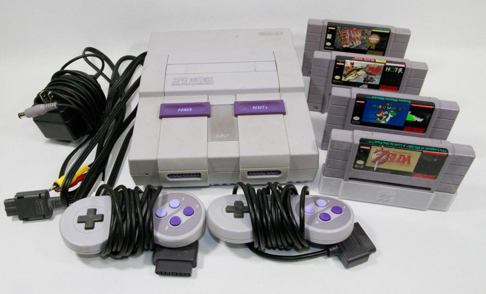 CONTROLLERS, ALL CABLES. GAMES ARE ZELDA A LINK TO THE PAST, SUPER MARIO WORLD, SIM CITY, AND SUPER BLACK BASS