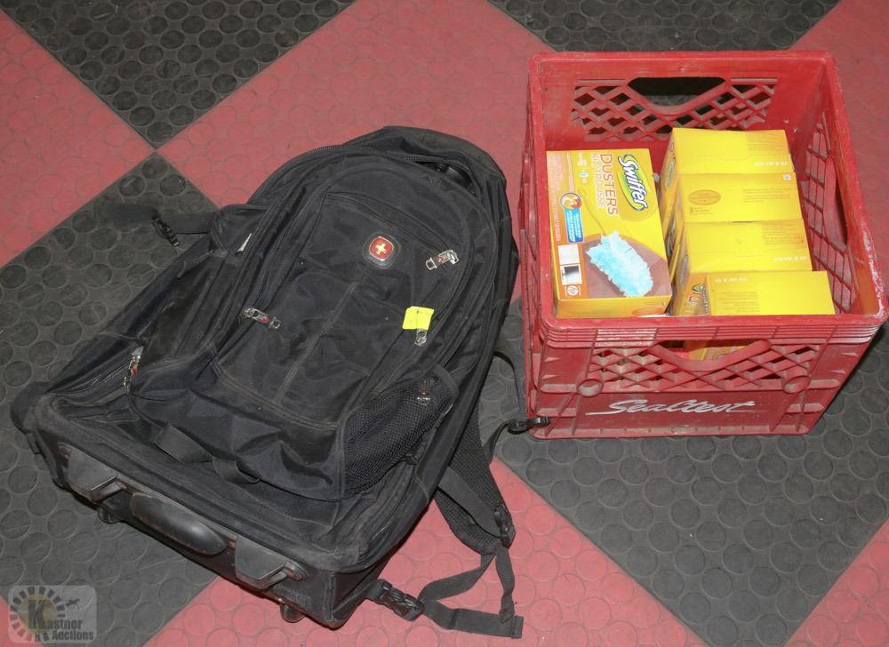 SWISS GEAR BACKPACK AND CRATE WITH CONTENTS