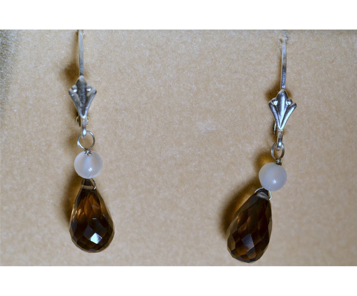 Pear Shaped Smokey Quartz with Translucent White Bead, Dangling Earrings