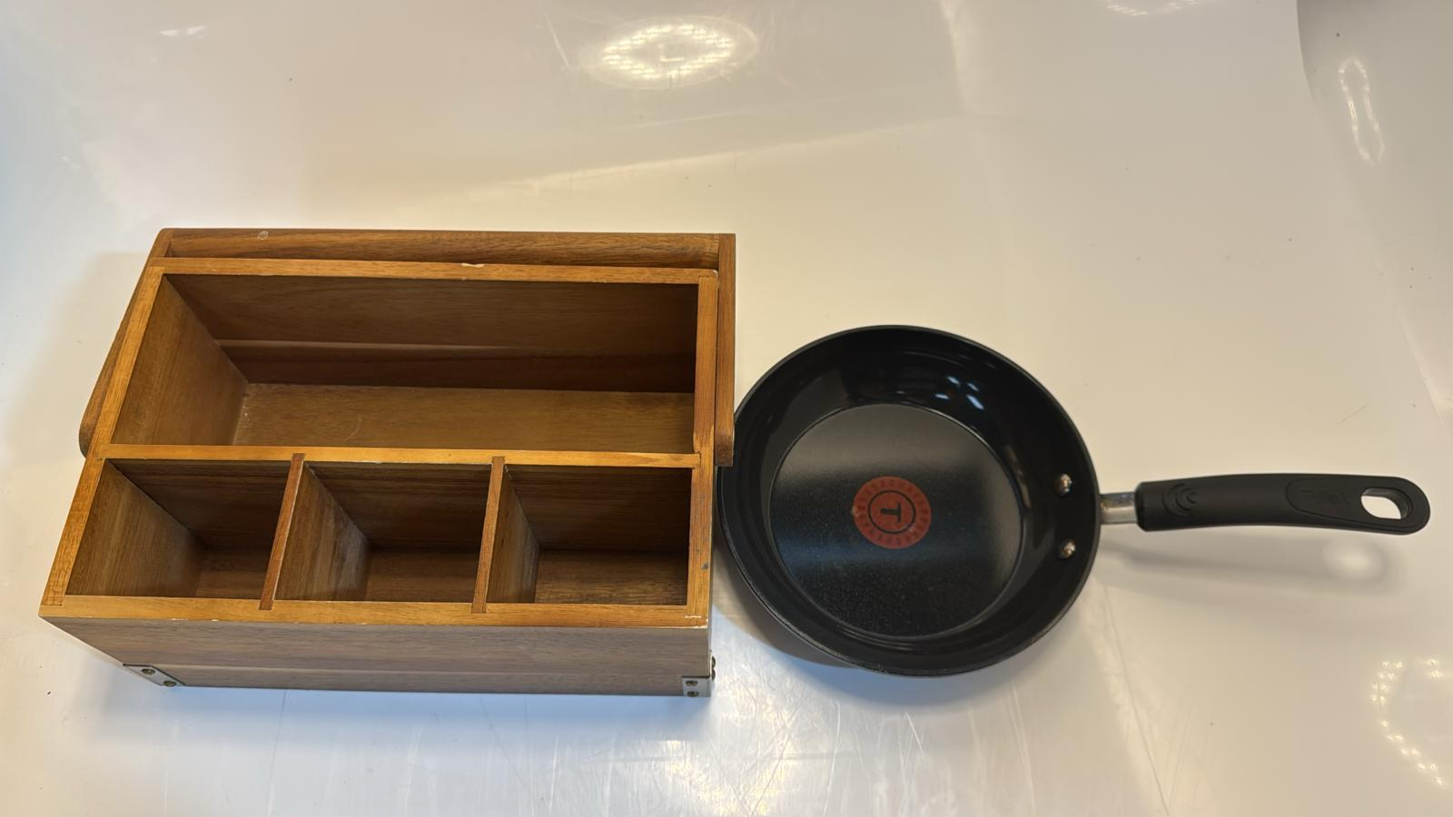 T-FAL CERAMIC NON-STICK SKILLET FRYING PAN, ACACIA WOOD COUNTERTOP UTENSIL CADDY (USED, BUNDLE)