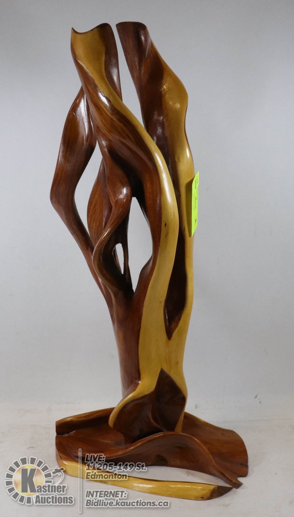 TALL WOOD STATUE VARIOUS COLORS OF WOOD, STANDS 21 INCHES TALL